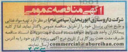 شرکت داروسازی ابوریحان ( سهامی عام ) در نظر دارد مواد غذایی و طبخ غذای پرسنل خود را از طریق مناقصه عمومی واگذار نماید . لذا از کلیه پیمانکاران واجد شرایط خواهشمند است جهت دریافت اسناد مناقصه ظرف مدت هفت روز کاری از تاریخ درج آگهی روزمه کاری خود را به آدرس commercial@bureihan.com ارسال نمایند.